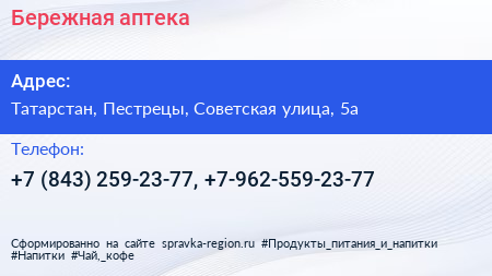 Бережная аптека по адресу Татарстан, Пестрецы, Советская улица, 5а в дальнейшем Организация, размещена в следующих категориях: