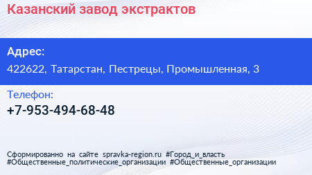 Казанский завод экстрактов по адресу 422622, Татарстан, Пестрецы, Промышленная, 3 в дальнейшем Организация, размещена в следующих категориях: