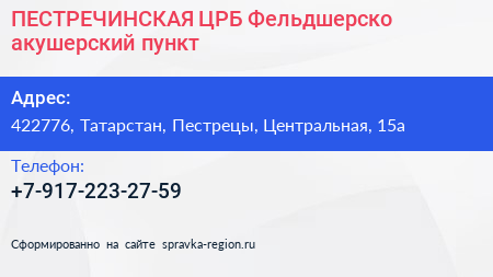 ПЕСТРЕЧИНСКАЯ ЦРБ, Фельдшерско-акушерский пункт по адресу 422776, Татарстан, Пестрецы, Центральная, 15а в дальнейшем Организация, размещена в следующих категориях: