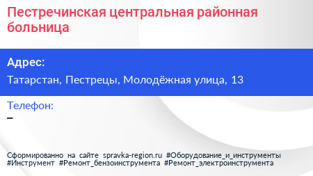 Пестречинская центральная районная больница по адресу Татарстан, Пестрецы, Молодёжная улица, 13 в дальнейшем Организация, размещена в следующих категориях: