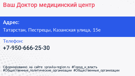 Ваш Доктор, медицинский центр по адресу Татарстан, Пестрецы, Казанская улица, 15е в дальнейшем Организация, размещена в следующих категориях: