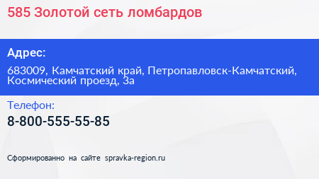 585*Золотой, сеть ломбардов по адресу 683009, Камчатский край, Петропавловск-Камчатский, Космический проезд, 3а в дальнейшем Организация, размещена в следующих категориях:
