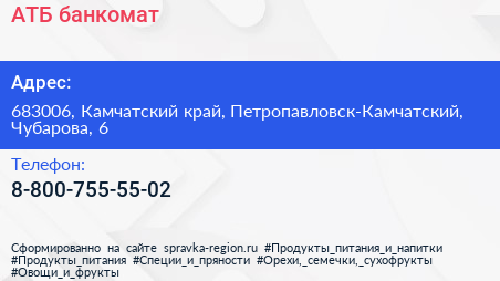 АТБ, банкомат по адресу 683006, Камчатский край, Петропавловск-Камчатский, Чубарова, 6 в дальнейшем Организация, размещена в следующих категориях: