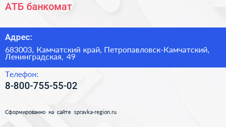 АТБ, банкомат по адресу 683003, Камчатский край, Петропавловск-Камчатский, Ленинградская, 49 в дальнейшем Организация, размещена в следующих категориях: