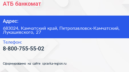 АТБ, банкомат по адресу 683024, Камчатский край, Петропавловск-Камчатский, Лукашевского, 27 в дальнейшем Организация, размещена в следующих категориях: