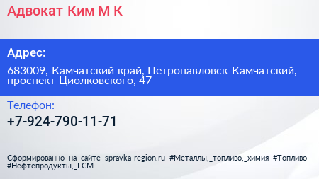 Адвокат Ким М.К. по адресу 683009, Камчатский край, Петропавловск-Камчатский, проспект Циолковского, 47 в дальнейшем Организация, размещена в следующих категориях: