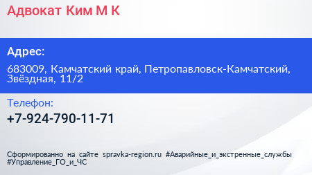 Адвокат Ким М.К. по адресу 683009, Камчатский край, Петропавловск-Камчатский, Звёздная, 11/2 в дальнейшем Организация, размещена в следующих категориях:
