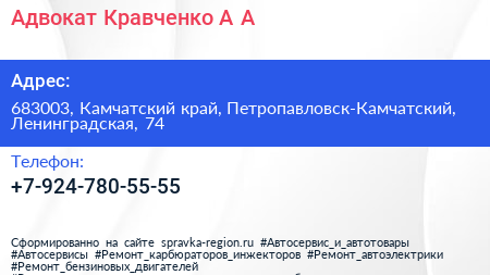 Адвокат Кравченко А.А. по адресу 683003, Камчатский край, Петропавловск-Камчатский, Ленинградская, 74 в дальнейшем Организация, размещена в следующих категориях: