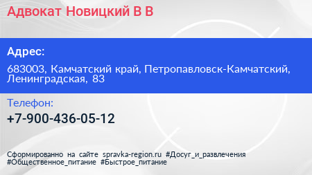 Адвокат Новицкий В.В. по адресу 683003, Камчатский край, Петропавловск-Камчатский, Ленинградская, 83 в дальнейшем Организация, размещена в следующих категориях: