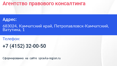 Агентство правового консалтинга по адресу 683024, Камчатский край, Петропавловск-Камчатский, Ватутина, 1 в дальнейшем Организация, размещена в следующих категориях: