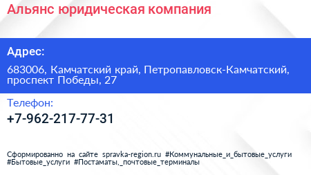 Альянс, юридическая компания по адресу 683006, Камчатский край, Петропавловск-Камчатский, проспект Победы, 27 в дальнейшем Организация, размещена в следующих категориях: