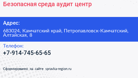 Безопасная среда, аудит-центр по адресу 683024, Камчатский край, Петропавловск-Камчатский, Алтайская, 8 в дальнейшем Организация, размещена в следующих категориях: