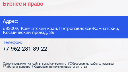 Бизнес и право по адресу 683009, Камчатский край, Петропавловск-Камчатский, Космический проезд, 3в в дальнейшем Организация, размещена в следующих категориях: