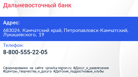 Дальневосточный банк по адресу 683024, Камчатский край, Петропавловск-Камчатский, Лукашевского, 19 в дальнейшем Организация, размещена в следующих категориях: