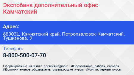 Экспобанк, дополнительный офис Камчатский по адресу 683031, Камчатский край, Петропавловск-Камчатский, Тушканова, 9 в дальнейшем Организация, размещена в следующих категориях: