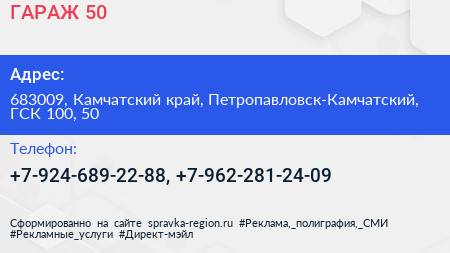 ГАРАЖ 50 по адресу 683009, Камчатский край, Петропавловск-Камчатский, ГСК 100, 50 в дальнейшем Организация, размещена в следующих категориях: