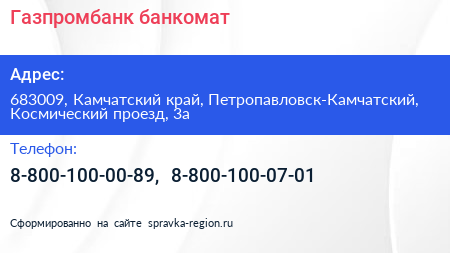 Газпромбанк, банкомат по адресу 683009, Камчатский край, Петропавловск-Камчатский, Космический проезд, 3а в дальнейшем Организация, размещена в следующих категориях: