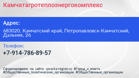 Камчатагротеплоэнергокомплекс по адресу 683020, Камчатский край, Петропавловск-Камчатский, Дальняя, 26 в дальнейшем Организация, размещена в следующих категориях: