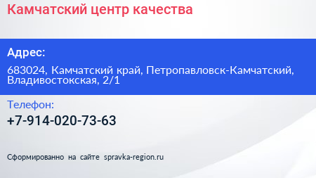 Камчатский центр качества по адресу 683024, Камчатский край, Петропавловск-Камчатский, Владивостокская, 2/1 в дальнейшем Организация, размещена в следующих категориях:
