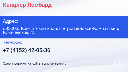 Канцлер-Ломбард по адресу 683003, Камчатский край, Петропавловск-Камчатский, Ключевская, 45 в дальнейшем Организация, размещена в следующих категориях: