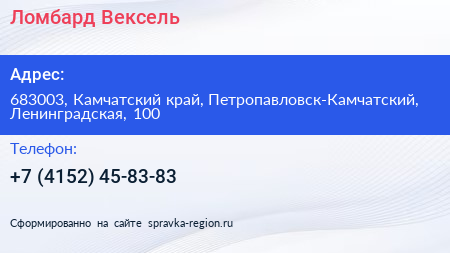 Ломбард-Вексель по адресу 683003, Камчатский край, Петропавловск-Камчатский, Ленинградская, 100 в дальнейшем Организация, размещена в следующих категориях: