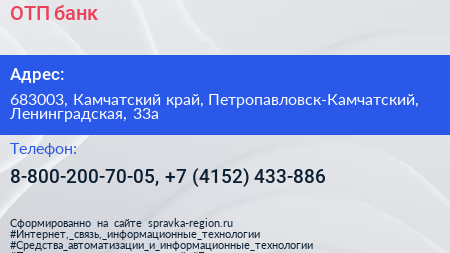 ОТП банк по адресу 683003, Камчатский край, Петропавловск-Камчатский, Ленинградская, 33а в дальнейшем Организация, размещена в следующих категориях: