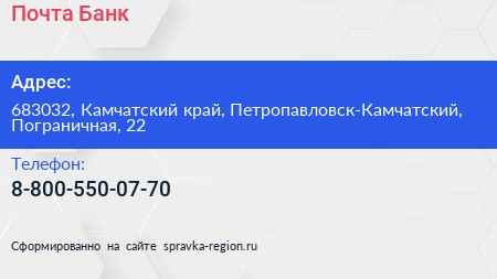 Почта Банк по адресу 683032, Камчатский край, Петропавловск-Камчатский, Пограничная, 22 в дальнейшем Организация, размещена в следующих категориях: