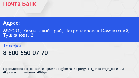 Почта Банк по адресу 683031, Камчатский край, Петропавловск-Камчатский, Тушканова, 2 в дальнейшем Организация, размещена в следующих категориях: