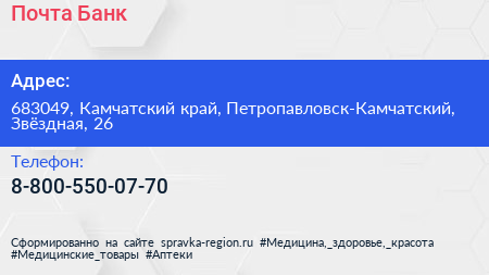Почта Банк по адресу 683049, Камчатский край, Петропавловск-Камчатский, Звёздная, 26 в дальнейшем Организация, размещена в следующих категориях:
