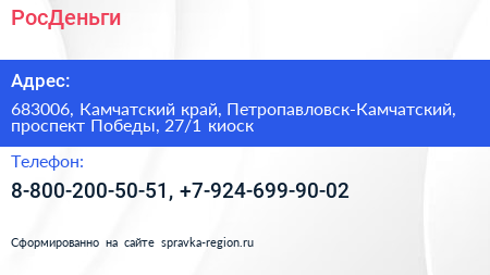 РосДеньги по адресу 683006, Камчатский край, Петропавловск-Камчатский, проспект Победы, 27/1 киоск в дальнейшем Организация, размещена в следующих категориях: