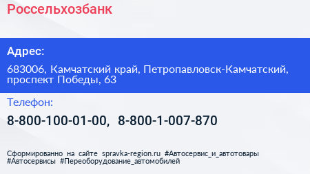 Россельхозбанк по адресу 683006, Камчатский край, Петропавловск-Камчатский, проспект Победы, 63 в дальнейшем Организация, размещена в следующих категориях: