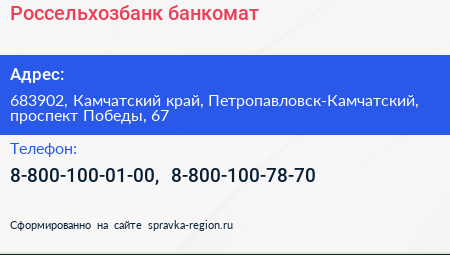 Россельхозбанк, банкомат по адресу 683902, Камчатский край, Петропавловск-Камчатский, проспект Победы, 67 в дальнейшем Организация, размещена в следующих категориях: