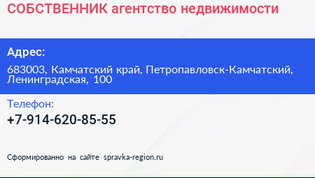 СОБСТВЕННИК, агентство недвижимости по адресу 683003, Камчатский край, Петропавловск-Камчатский, Ленинградская, 100 в дальнейшем Организация, размещена в следующих категориях: