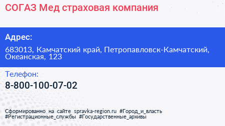 СОГАЗ-Мед, страховая компания по адресу 683013, Камчатский край, Петропавловск-Камчатский, Океанская, 123 в дальнейшем Организация, размещена в следующих категориях:
