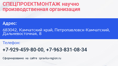 СПЕЦПРОЕКТМОНТАЖ, научно-производственная организация по адресу 683042, Камчатский край, Петропавловск-Камчатский, Дальневосточная, 8 в дальнейшем Организация, размещена в следующих категориях: