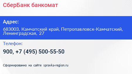 СберБанк, банкомат по адресу 683003, Камчатский край, Петропавловск-Камчатский, Ленинградская, 27 в дальнейшем Организация, размещена в следующих категориях: