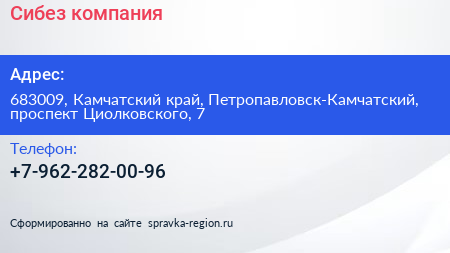 Сибез, компания по адресу 683009, Камчатский край, Петропавловск-Камчатский, проспект Циолковского, 7 в дальнейшем Организация, размещена в следующих категориях: