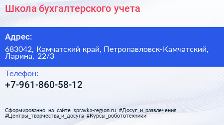 Школа бухгалтерского учета по адресу 683042, Камчатский край, Петропавловск-Камчатский, Ларина, 22/3 в дальнейшем Организация, размещена в следующих категориях: