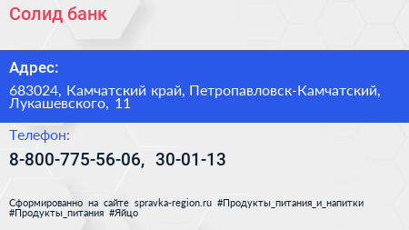 Солид банк по адресу 683024, Камчатский край, Петропавловск-Камчатский, Лукашевского, 11 в дальнейшем Организация, размещена в следующих категориях: