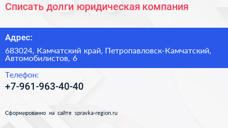 Списать долги, юридическая компания по адресу 683024, Камчатский край, Петропавловск-Камчатский, Автомобилистов, 6 в дальнейшем Организация, размещена в следующих категориях: