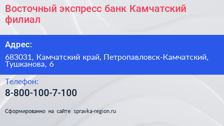 Восточный экспресс банк, Камчатский филиал по адресу 683031, Камчатский край, Петропавловск-Камчатский, Тушканова, 6 в дальнейшем Организация, размещена в следующих категориях: