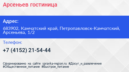 Арсеньев, гостиница по адресу 683902, Камчатский край, Петропавловск-Камчатский, Арсеньева, 1/2 в дальнейшем Организация, размещена в следующих категориях: