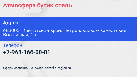 Атмосфера, бутик-отель по адресу 683003, Камчатский край, Петропавловск-Камчатский, Вилюйская, 15 в дальнейшем Организация, размещена в следующих категориях: