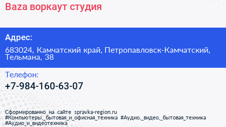 Baza, воркаут-студия по адресу 683024, Камчатский край, Петропавловск-Камчатский, Тельмана, 38 в дальнейшем Организация, размещена в следующих категориях: