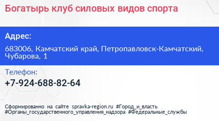 Богатырь, клуб силовых видов спорта по адресу 683006, Камчатский край, Петропавловск-Камчатский, Чубарова, 1 в дальнейшем Организация, размещена в следующих категориях: