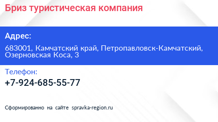 Бриз, туристическая компания по адресу 683001, Камчатский край, Петропавловск-Камчатский, Озерновская Коса, 3 в дальнейшем Организация, размещена в следующих категориях: