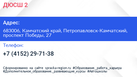 ДЮСШ №2 по адресу 683006, Камчатский край, Петропавловск-Камчатский, проспект Победы, 27 в дальнейшем Организация, размещена в следующих категориях: