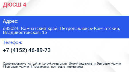 ДЮСШ №4 по адресу 683024, Камчатский край, Петропавловск-Камчатский, Владивостокская, 15 в дальнейшем Организация, размещена в следующих категориях: