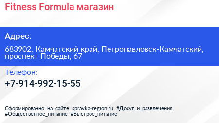 Fitness Formula, магазин по адресу 683902, Камчатский край, Петропавловск-Камчатский, проспект Победы, 67 в дальнейшем Организация, размещена в следующих категориях: