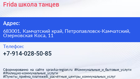 Frida, школа танцев по адресу 683001, Камчатский край, Петропавловск-Камчатский, Озерновская Коса, 11 в дальнейшем Организация, размещена в следующих категориях: